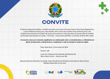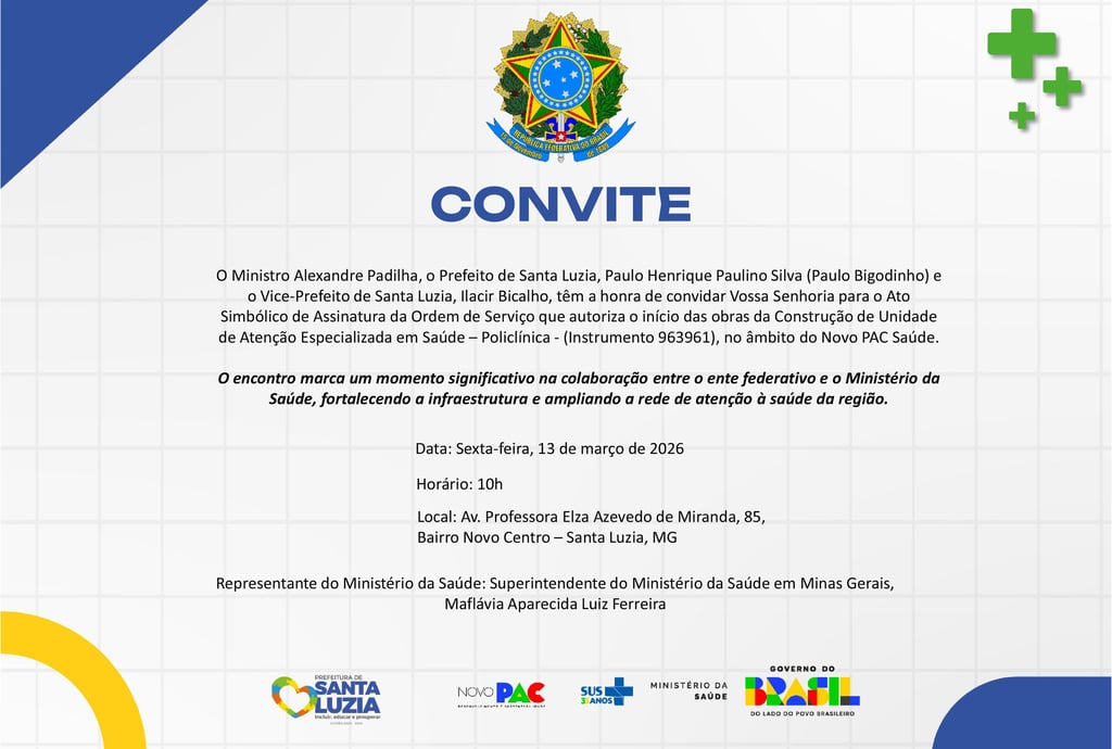 A Prefeitura de Santa Luzia realizará, na próxima sexta-feira, 13 de março, às 10h, o ato simbólico de assinatura da ordem de serviço que autoriza o início das obras da nova Policlínica, unidade de atenção especializada em saúde que será construída no município por meio do programa Novo PAC Saúde.